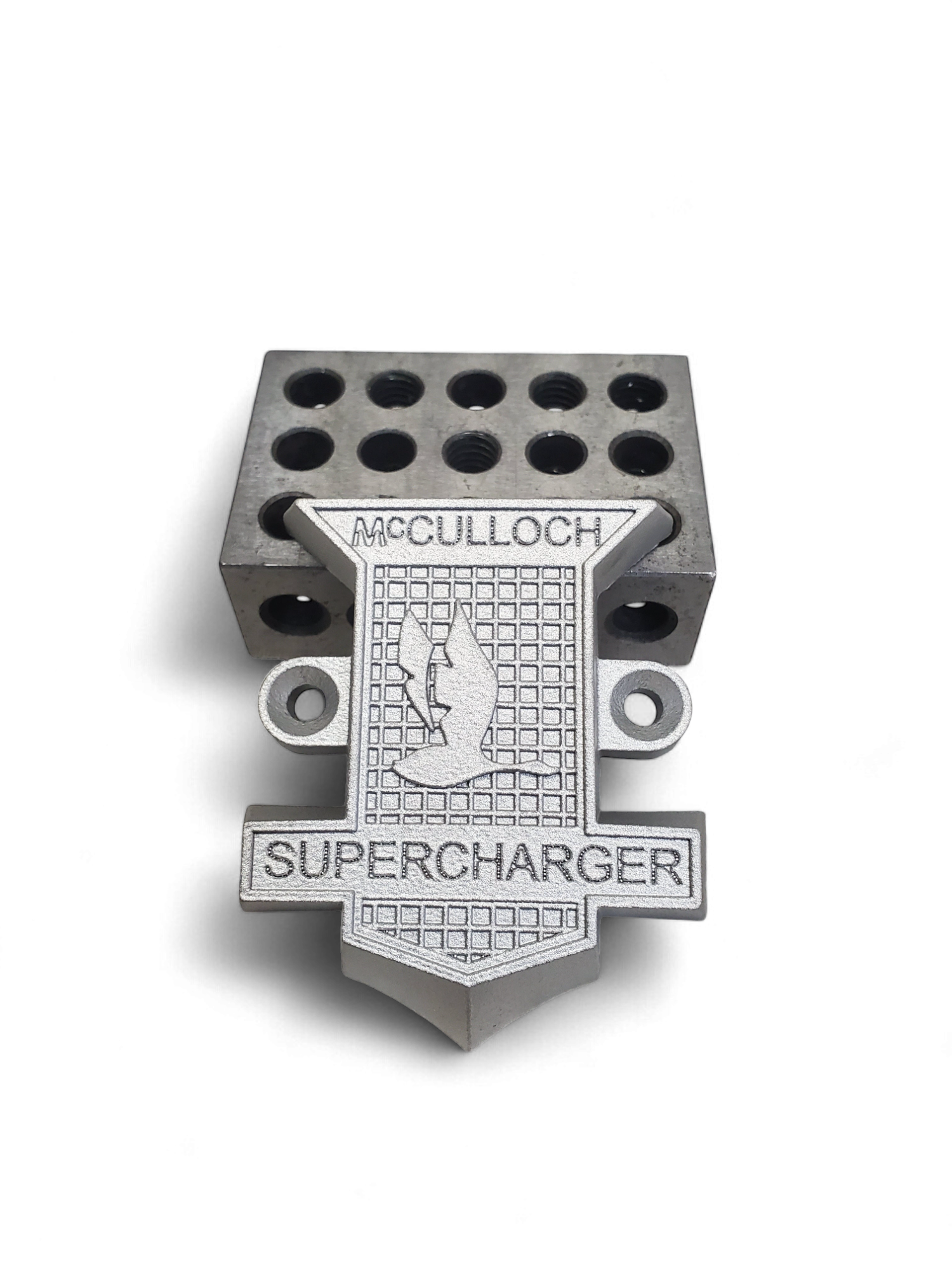 This is our direct replacement for your missing VS57 McCulloch supercharger emblem. Finished in bare bed blasted aluminum with hardware included.
