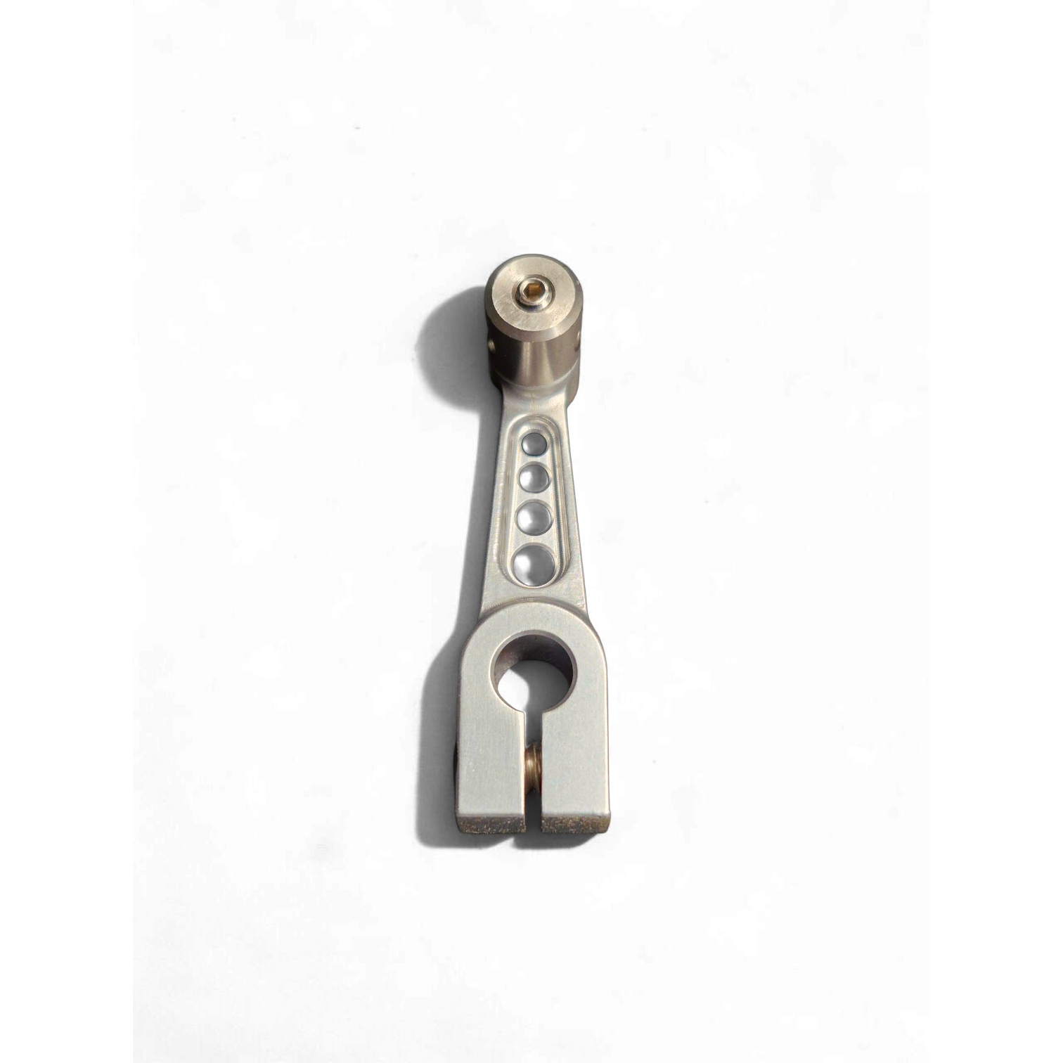 Each arm is meticulously carved out of 6061 aluminum and given a tumbled finish. An oil-lite bronze bushing is pressed into the swivel end to ensure longevity and smooth motion. Retained in the bushing is a bespoke stainless steel swivel that fastens to a 3/16 rod. The swivel is retained by an E-clip, and is tightly toleranced to avoid slop and premature wear. Both screws are 304 stainless steel. Arm's overall length of 1.95"